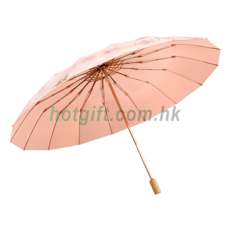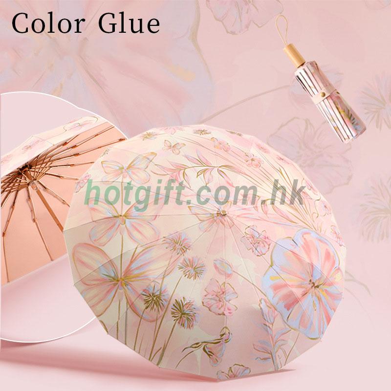 三摺傘,傘布材質: 碰擊布,傘骨材質:鐵。中棒材質:鐵。傘布過膠:彩膠。16骨粉金蝴蝶系列。加厚粉色彩膠,晴雨兩用,UPF50+UVA90% 有效阻隔紫外線。